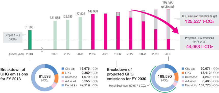 The Group aims to reduce greenhouse gas (Scopes 1 and 2) emissions by FY 2030 by 46% compared to FY 2013.