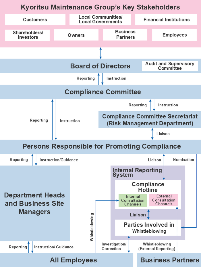 The Compliance Committee Secretariat is under the jurisdiction of the Risk Management Department, and oversees the operation of compliance. The Compliance Committee implements the PDCA cycle for compliance-related matters on a quarterly basis and distributes the Kyoritsu Maintenance Group Compliance Manual to all officers and employees to inform them of the Company’s basic stance on compliance and compliance requirements, while working to raise awareness among officers and employees through internal training and the dissemination of information. Additionally, the General Managers of Kyoritsu Maintenance as well as the presidents of Group companies have been designated as persons responsible for promoting compliance as part of efforts to implement compliance practices tailored to the operations of the respective departments within the Group. Furthermore, whistleblowing hotlines have been established to enable the early detection of inappropriate conduct.