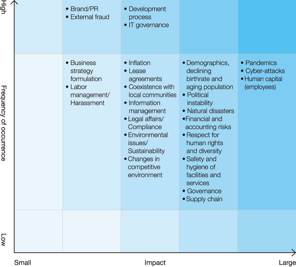 Through this initiative, the Company identifies business risks in view of the rapidly changing social environment and heightened uncertainty, thereby striving to enhance accountability to stakeholders with regard to the risks it faces. Furthermore, a key objective in assessment efforts is to enhance risk management literacy and risk sensitivity among all officers and employees through the processes of risk visualization and evaluation.