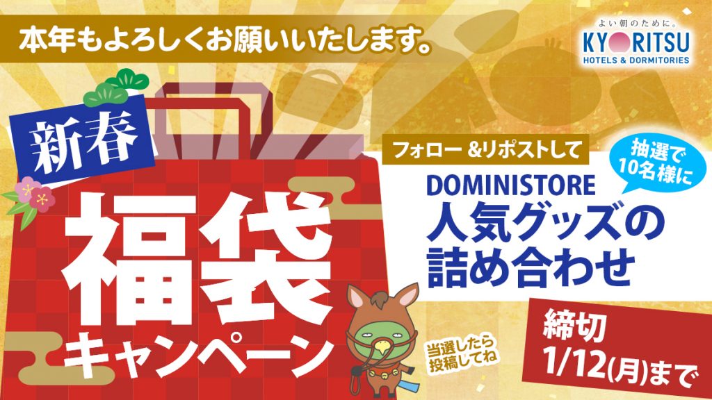 2026年の幕開けを記念して、共立メンテナンス公式X(旧Twitter)にて、ドーミーインの公式通販サイト「DOMINISTORE (ドミニストア)」の人気グッズを詰め合わせた「特製福袋」が当たるプレゼントキャンペーンを開催いたします!