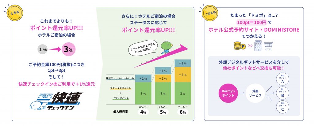 たまった「Dormy’sポイント」は、100ポイント=100円で、ホテル公式予約サイトまたはDormy’s公式アプリでのご予約時・DOMINISTOREでのご購入時にご利用いただけます。