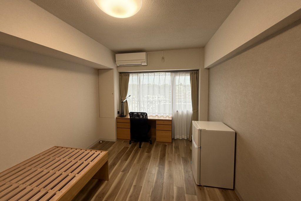居室はプライベート空間を確保したバス・トイレ完備のマンションタイプです。室内には、ベッドや収納クローゼットのほか、2ドア冷蔵庫といった生活に欠かせない家具・家電をあらかじめ完備。