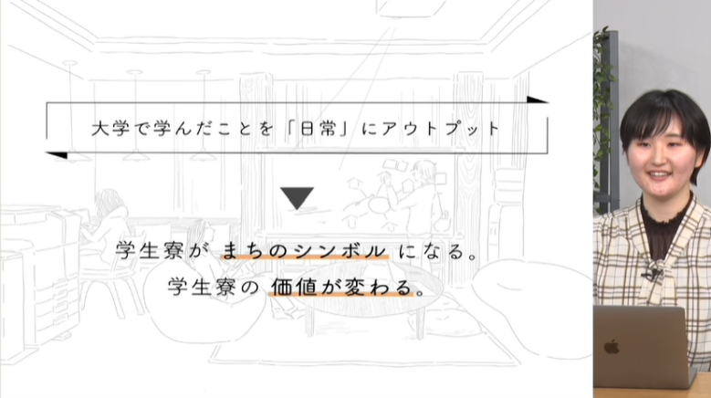 コロナ禍において、地域との関わりが希薄であること、寮内の活気がないことに気づく。地域の紹介ブックの作成や交流イベントを企画。「コロナ禍でも生き生きした寮」をテーマに周辺地域を巻き込み、寮内・地域の活性化を目指すと発表しました。