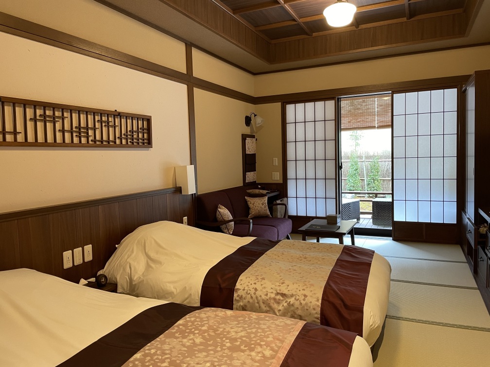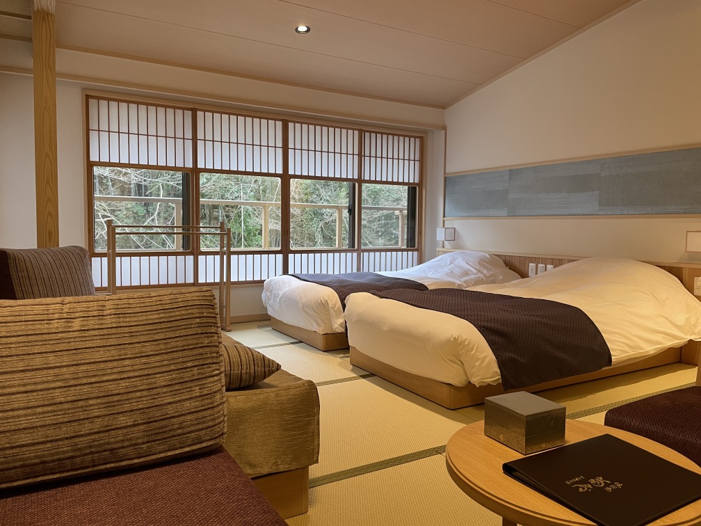 「風の語り部」は、和の温もりに包まれる畳敷きのモダンな客室です。家具をコンパクトに配置し、ご友人やカップルで快適にお過ごしいただけます。また客室棟1階にある休み処では、自然豊かな中庭を望むことができ、ビールやおつまみ、ソフトドリンクなどをご用意しております。