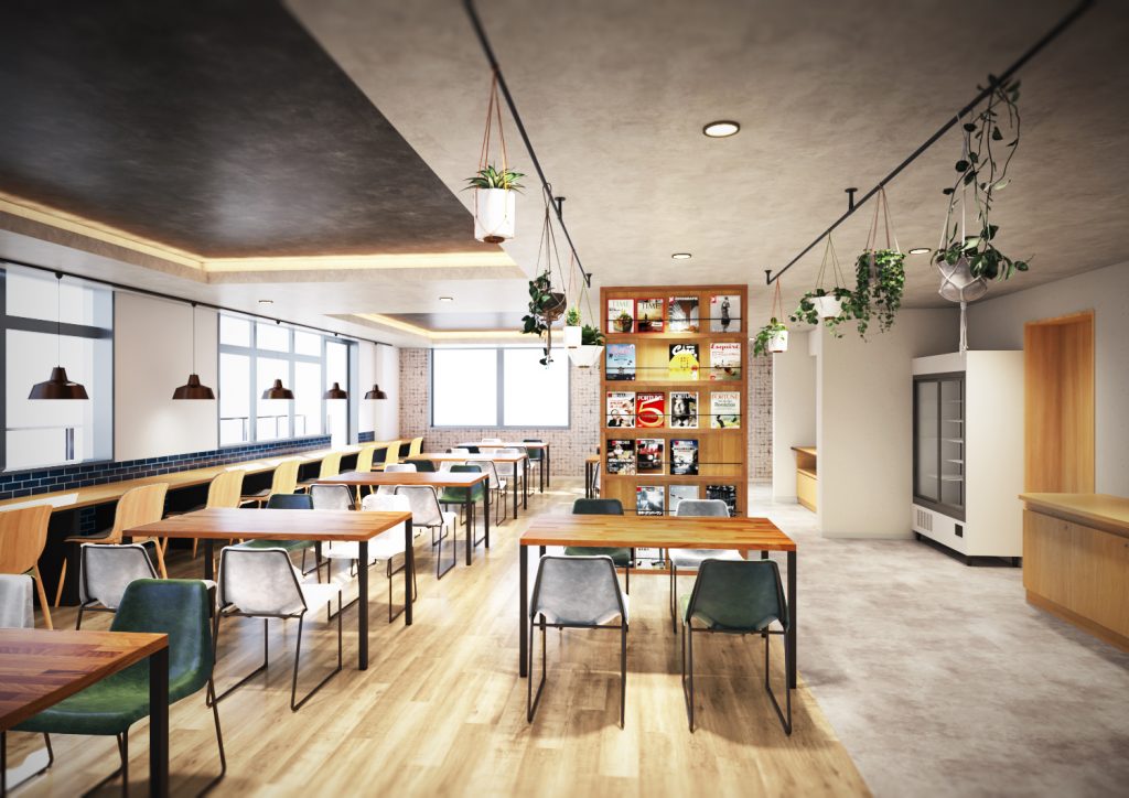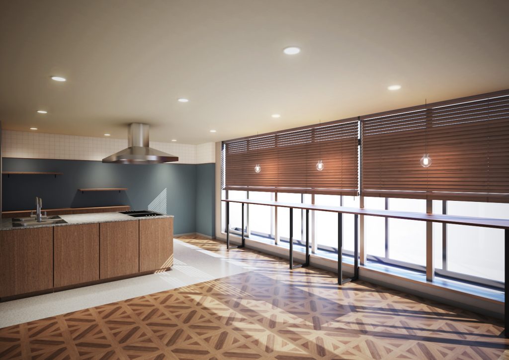 ダイニングルームは、都会のカフェをイメージした設えで、毎日の食事を落ち着いた癒しの空間でお召し上がりいただけます。ダイニングルームの隣には、キッチンコーナーを完備しており、お好きな時間に自炊をすることができます。窓際のカウンター席には、コンセントが完備されており、パソコンを使用した勉強を効率的に行うことができます。
