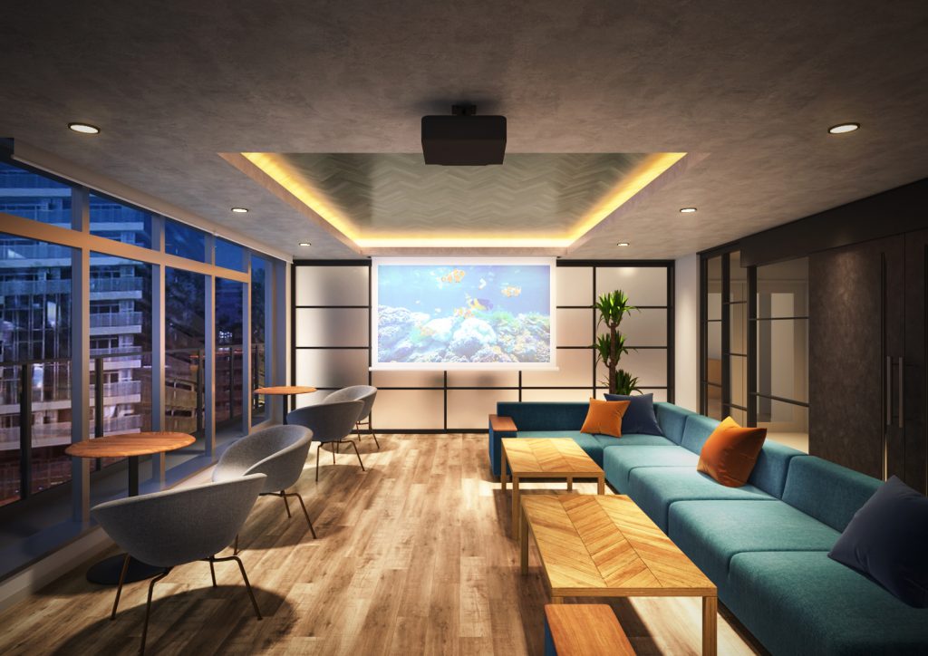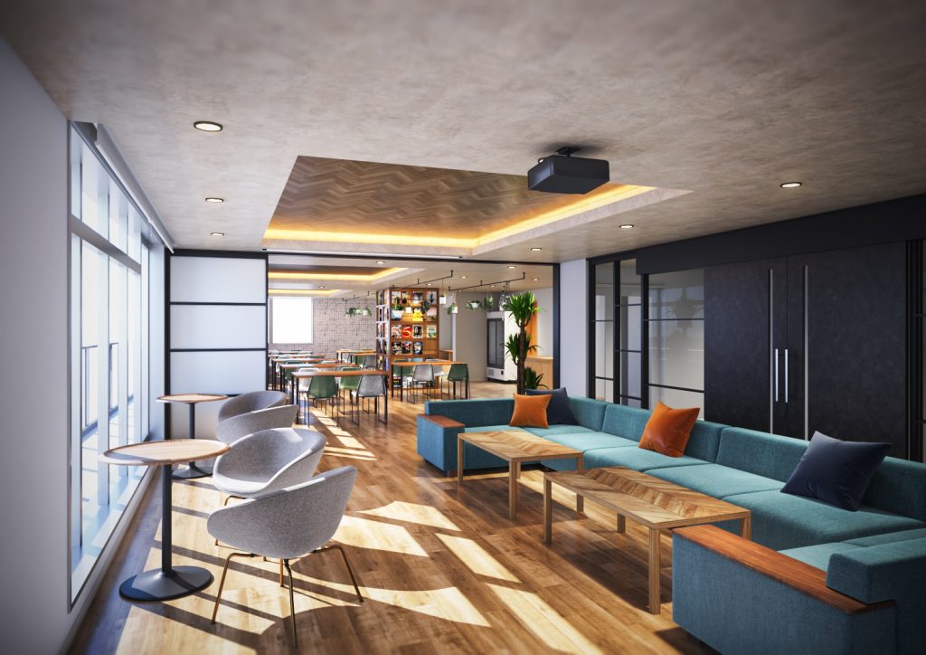 ラウンジには、大きなガラス張りの窓があり、採光性が高く開放感があるつくりになっています。照明を調節することができ、朝・昼は太陽の自然の光を楽しみ、夜はバーのような雰囲気にもできます。プロジェクター、スピーカーも完備しており、都心の景色を眺めながらコミュニティーを育むことができるラウンジです。