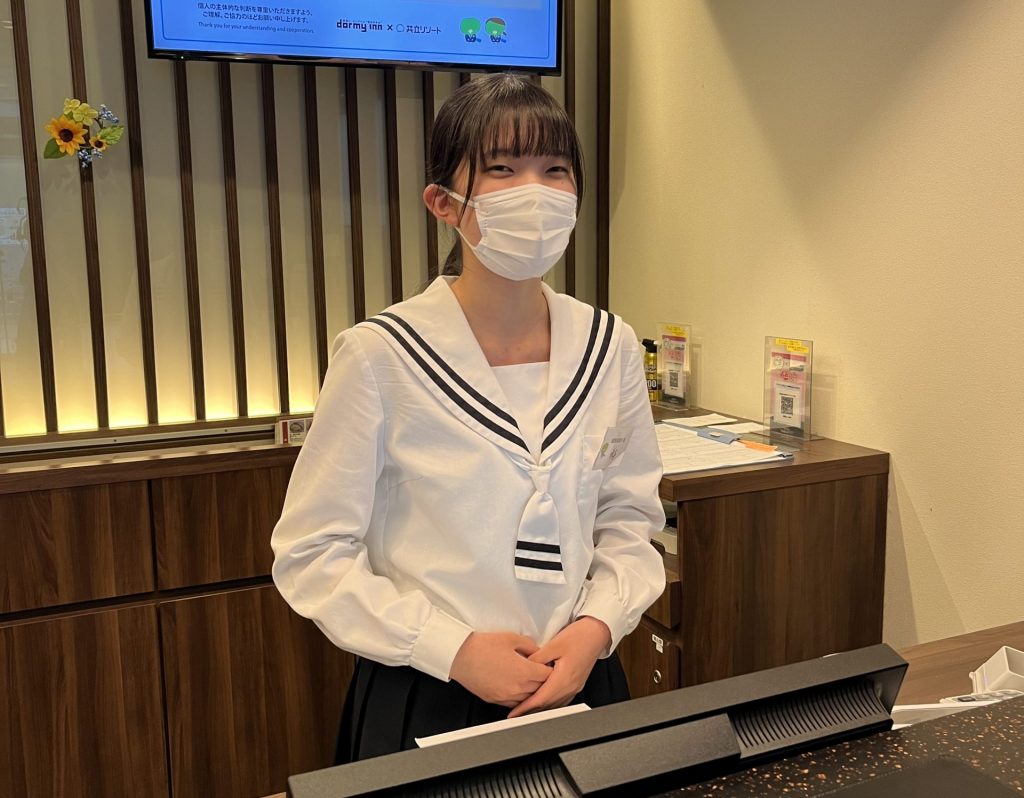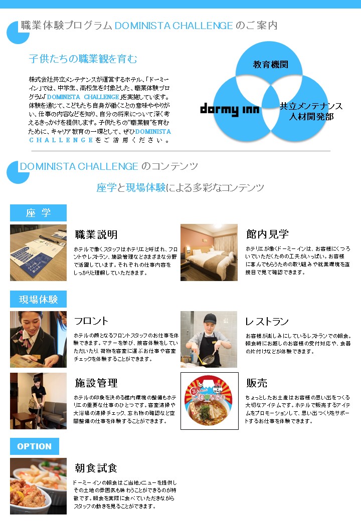 「ドーミーイン」では、2019年より中・高校生を対象にホテリエの仕事であるフロント受付対応や客室清掃などの職業を体験していただく「DOMINISTA CHALLENGE」を実施しています。プログラム内では、それぞれの担当部署の仕事内容や役割について学ぶことや、体験を通じて学生たちが働くことの意味ややりがい、お客様に快適に過ごしていただくための業務内容を知り、学生たちの“職業観”を育み、キャリア教育の一環として、学びの場を提供しています。