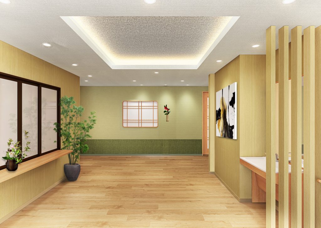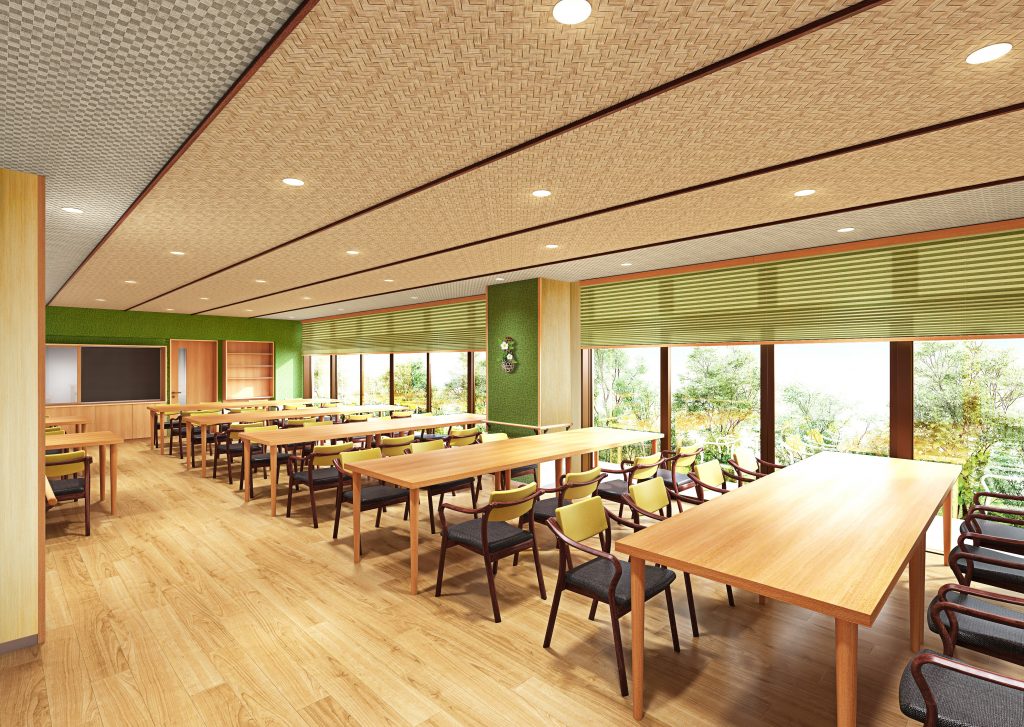 当社が運営するビジネスホテル「ドーミーイン」の和風プレミアムブランド「御宿 野乃」やリゾートホテル「共立リゾート」の旅館のように「和」をテーマにした空間設計。エントランスは旅館のような設えが特長。食堂は和の素材を随所に取り入れ落ち着いた雰囲気を演出しています。