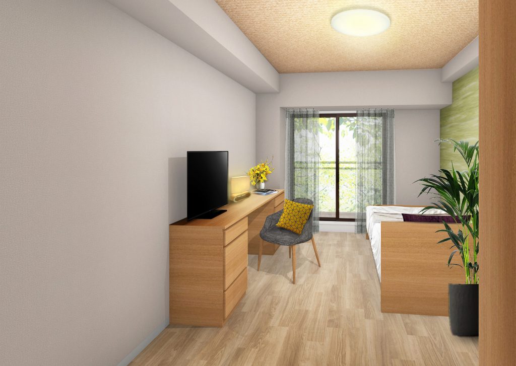 居室設備:介護用ベッド、トイレ、洗面化粧台、エアコン、収納、照明器具、カーテン、安心コール、見守りAIセンサー