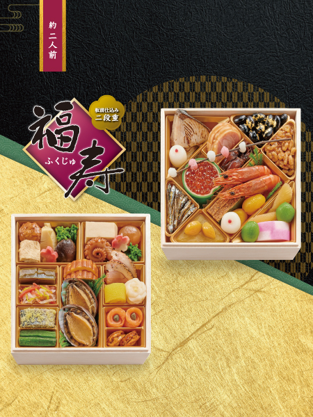 ■板前仕込み 二段重 【福寿】 料金:15,500円(税込・送料込) 内容: ●壱ノ重 杏子さわやか煮、いくらの醬油漬、ほたるいかしぐれ煮、柚子餡餅 ほか ●弐ノ重 鮑生姜煮、日向夏さわやか煮、かじき昆布〆、合鴨団子、梅麩 ほか