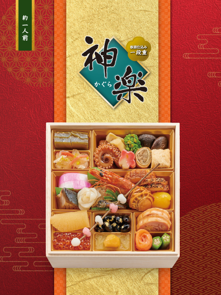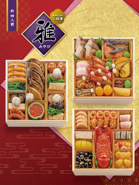 ・ 一段重『神楽』、二段重『福寿』、三段重『雅』の3種類をご用意し、こだわりの食材を厳選しています。