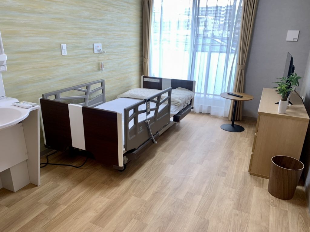 居室設備:介護用ベッド、トイレ、洗面化粧台、エアコン、収納、照明器具、カーテン、安心コール、見守りAIセンサー