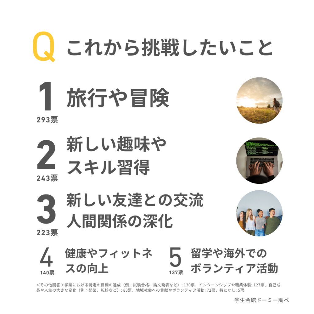 - 学生たちは新たな挑戦を望んでおり、特に「旅行」や「冒険」が多くの支持を集めた。