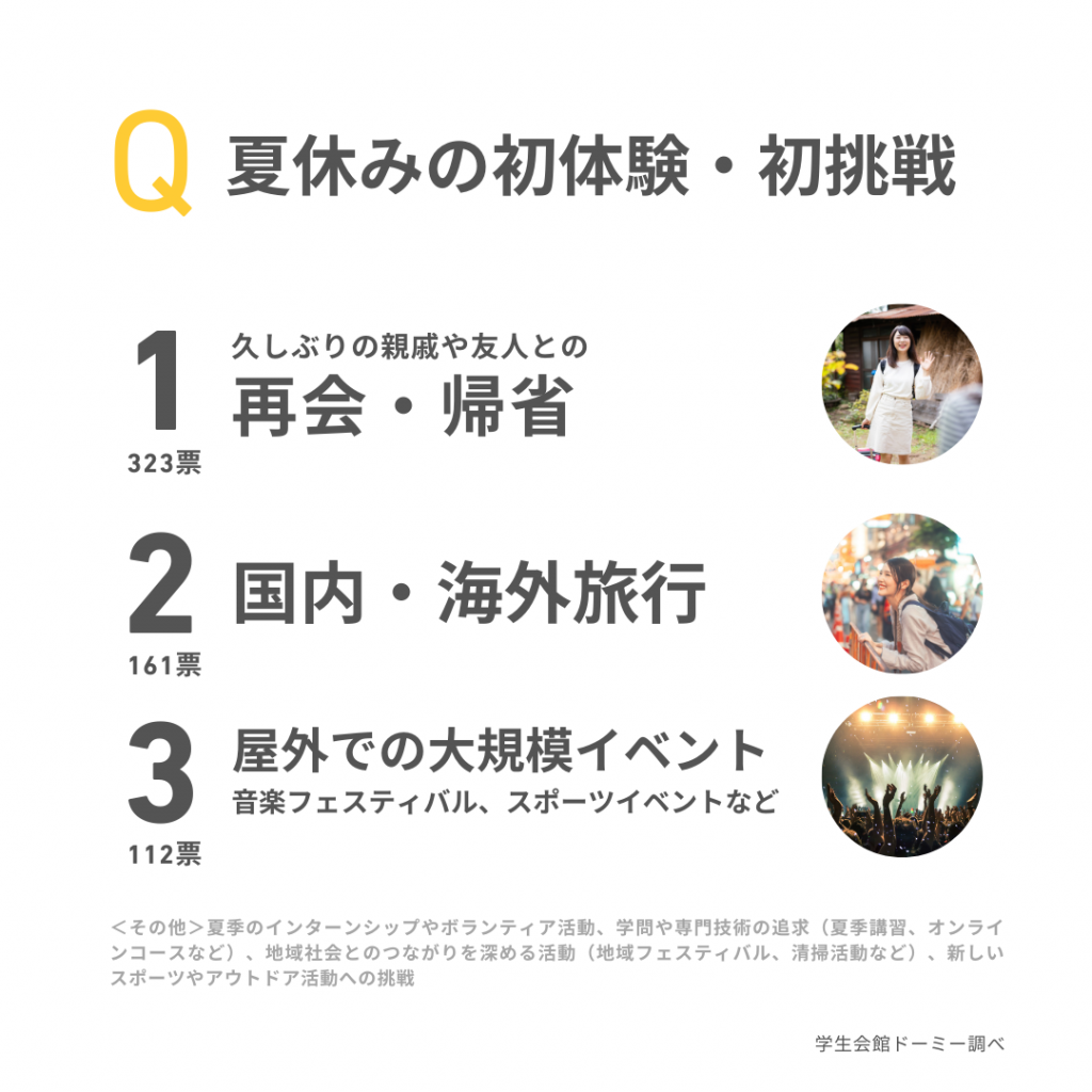 - 学生たちは夏休みに新たな活動に挑戦し、その中でも「親戚や友人との再会」が最も多かった。