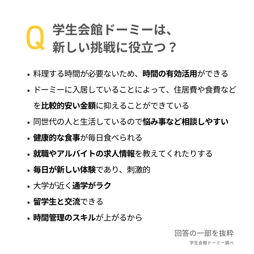 - 『学生会館ドーミー』での生活は「新たな挑戦に役立つ」として、特に「経済的な利点や時間の有効活用」、「コミュニティ形成」、「健康的な食事提供」が評価された。