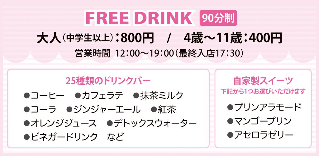 | メニュー | 【ドリンクバー】全25種類 ・コーヒー ・カフェラテ ・抹茶ミルク ・コーラ ・ジンジャーエール ・紅茶 ・オレンジジュース ・デトックスウォーター ・ビネガードリンク など 【自家製スイーツ】※下記1つからお選びいただけます ・プリンアラモード ・マンゴープリン ・アセロラゼリー