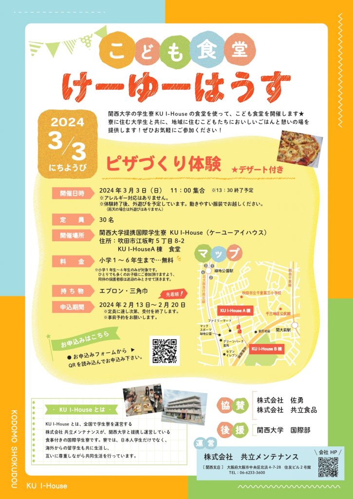 「ドーミー」の名称で全国約500棟以上の学生寮・社員寮を展開する株式会社共立メンテナンス(以下、共立メンテナンス/代表取締役社長:中村幸治/本社:東京都千代田区)は、運営寮の関西大学(学長:前田裕/場所:大阪府吹田市)の提携国際学生寮「KU I-House」にて3月3日(日)に『こども食堂 けーゆーはうす ピザづくり体験』を開催いたします。
