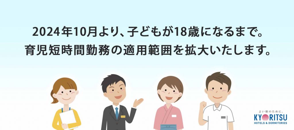 全国に展開する学生寮・社員寮「ドーミー」、ホテル「ドーミーイン」・「共立リゾート」、首都圏を中心とした高齢者向け住宅「ドーミーシニア」を運営する株式会社共立メンテナンス(以下、共立メンテナンス/代表取締役社長:中村幸治/本社:東京都千代田区)は、2024年10月より従業員(正社員・契約社員・パート社員)の育児短時間勤務について、その対象を「3歳になるまで」から「18歳になるまで」と適用範囲を拡大いたします。