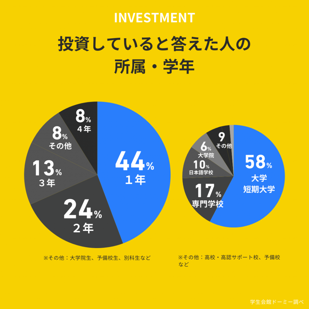 ・約5人に1人の学生が投資を行っており、その中でも大学1・2年生が投資に最も積極的。