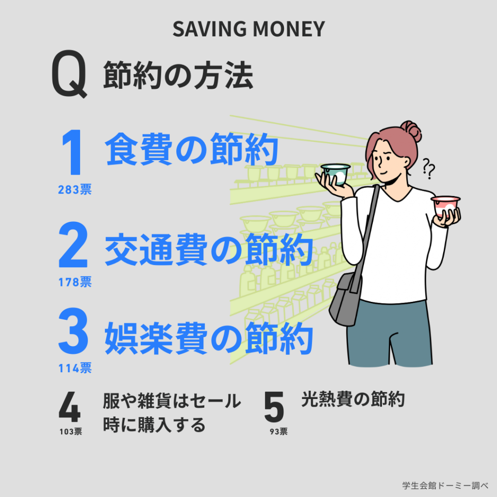学生の96%が日々の生活において節約を実践していることが明らかになりました。「特に意識していない」と回答したのはわずか4%でした。特に食費削減は最も一般的な節約方法で、283票となりました。多くの学生がコストを抑えるために自炊を増やし、安価なスーパーマーケットを利用することで、外食を減らしています。また交通費の節約(178票)、娯楽費の節約(114票)、セール時の購入(103票)も、学生たちが日々の支出を管理するための重要な手段となっています。これらの節約行動は、コストパフォーマンスの高い選択を重視する学生たちの傾向を示しています。
