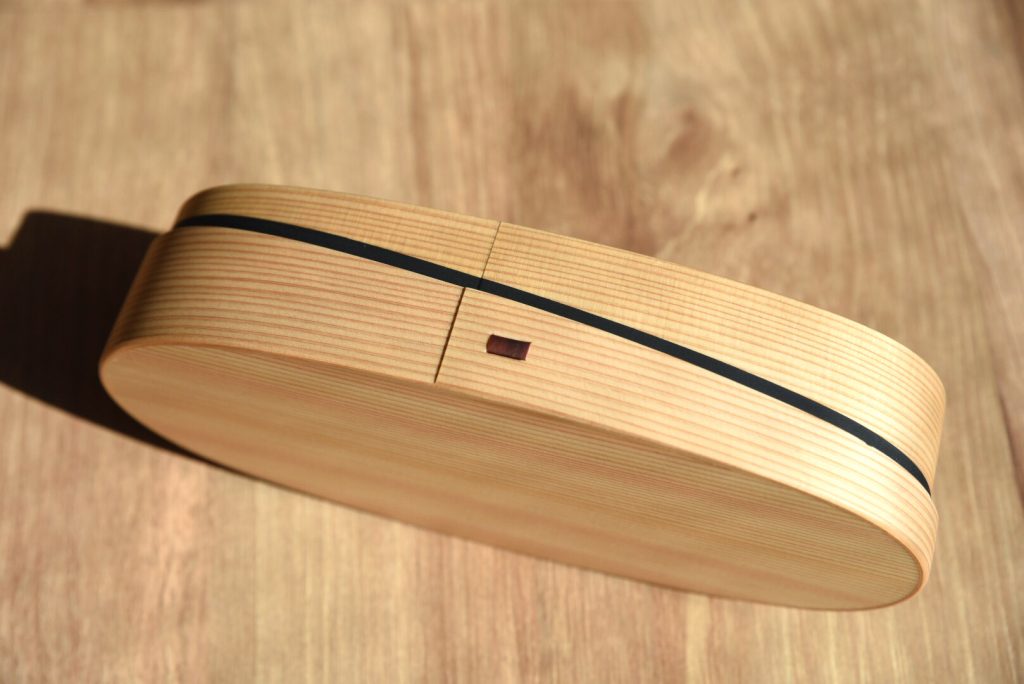 形は、一般的な曲げわっぱより縦長で、スタイリッシュに仕上げています。容量は一見小さく見えますが、深さがある分しっかりとごはんを詰めることができます。縦長だからこそビジネスバックのようなマチの狭い鞄にも綺麗に収まります。ふたの切り口が斜めになっているのもポイントです!