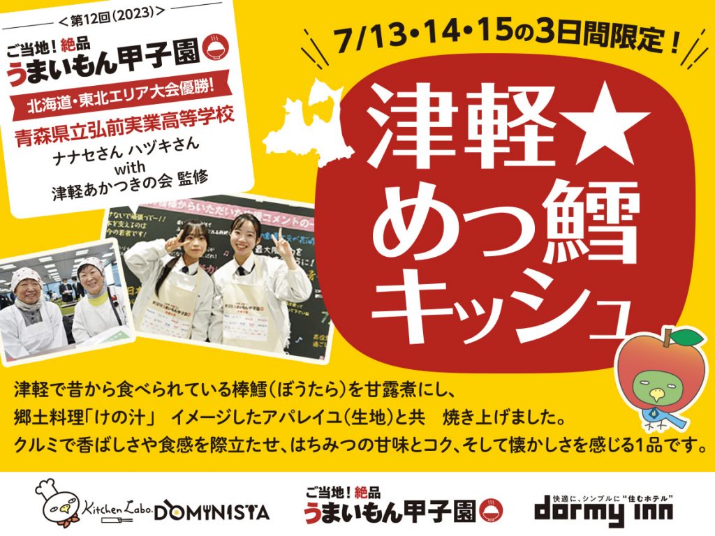 株式会社共立メンテナンス(以下、共立メンテナンス/代表取締役社長:中村幸治/本社:東京都千代田区)が運営する『ドーミーイン弘前』にて、「第12回(2023)ご当地!絶品うまいもん甲子園」北海道・東北エリア大会で優勝した「青森県立弘前実業高等学校」の学生様が考案したメニュー「津軽☆めっ鱈キッシュ」を、2024年7月13日(土)~15日(月)の3連休の特別メニューとして朝食バイキングにて提供いたします。