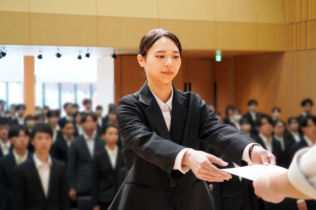 内定式には、代表取締役社長 中村 幸治と、取締役 管理グループ担当兼人事総務本部 本部長 武者 隆之が登壇し、日本の観光業をはじめ、当社の食、住のサービスを担う内定者に向けて歓迎の言葉を述べられ、内定通知書が授与されました。
