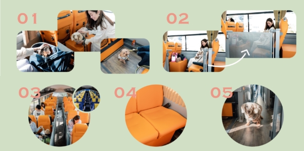 03)座席は、前後にずらし互い違いに設置され、わんちゃん同士けんかしない設計です。