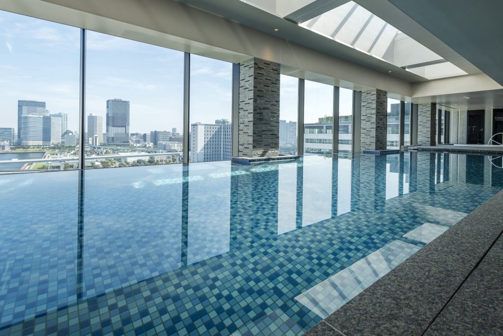 大浴場と同じフロアには、リゾート感漂うインフィニティ風の屋内プールやジャグジーを完備。大きな窓からは、パノラマ写真のような都会の街並みを一望できます。その他にも、エステルームやスカイラウンジも併設し、アーバンリゾートとしての機能も充実しています。
