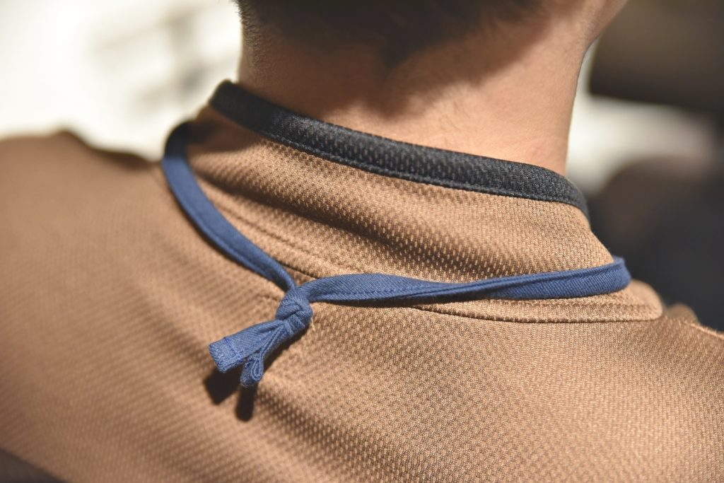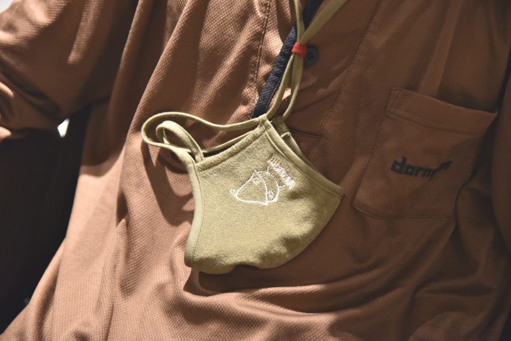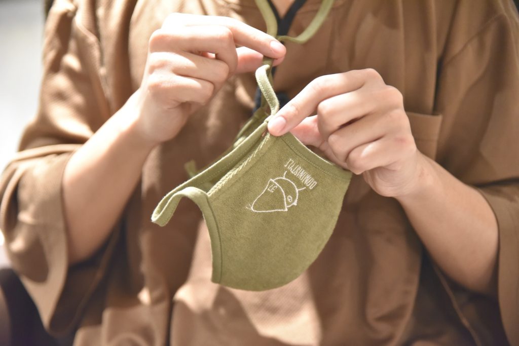マスクの左下にある「サウナ―いんこ」をプリントではなく、刺繍にしました。100℃近くになるドライサウナの中で、プリントが施されているマスクを使用すると、プリント部分が熱を持ってしまいます。そちら防ぐため、「サウナーいんこ」は手間のかかる刺繍に、熱を持ちやすいポリエステル製のタグ類も全てカットしました。