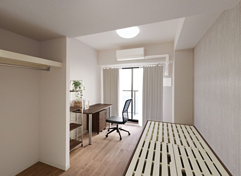 | 居室設備 | エアコン/Wi-Fi/TV端子/ベッド/机/椅子/電気スタンド/クローゼット/シューズロッカー/照明器具/カーテン/バスルーム/シャワー付きトイレ/2ドア冷蔵庫/ベランダ |