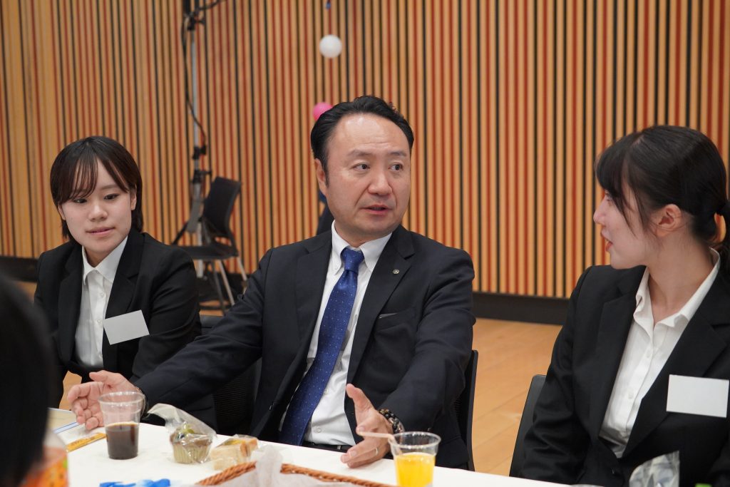 今年度より目的としていた、役員と内定者による密度の濃い交流も実現しました。役員が各テーブルをまわり、フランクに歓談する時間を設けた結果、内定者からはキャリア形成や入社後の働き方に関する積極的な質問が相次ぎました。内定者の皆様は、役員からの貴重な経験談や経営層の視点に熱心に耳を傾け、今後のキャリアと当社への理解を一層深める、有意義な時間となりました。