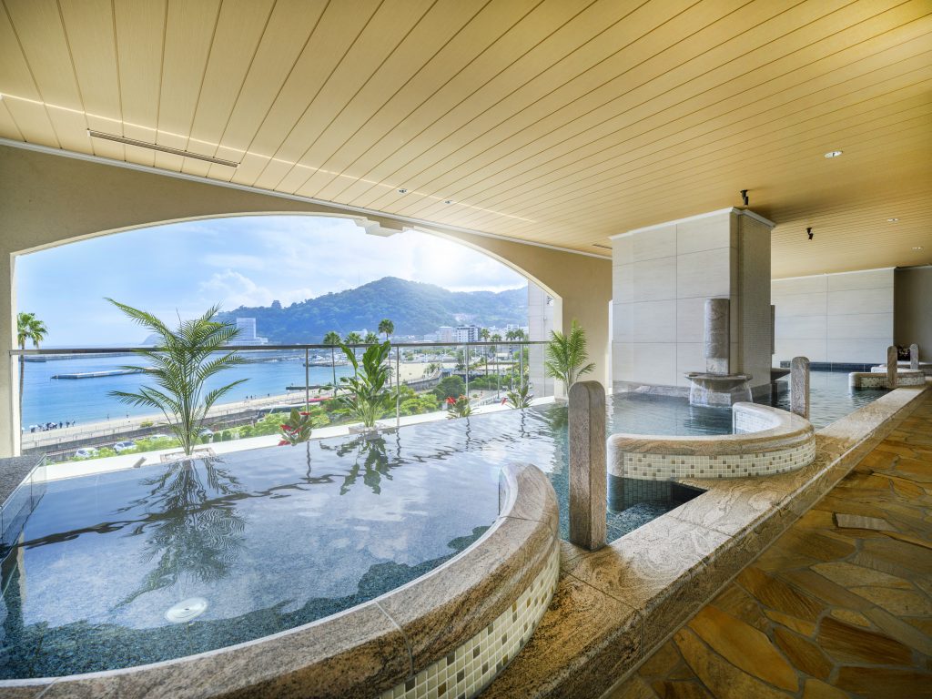 上層階の客室では天然温泉の露天風呂を完備し、プライベートな空間で名湯を愉しめます。また、湯浴み着を着用して男女一緒に絶景を楽しめる「展望露天風呂」や、海を望む、予約不要で24時間無料で利用可能な4つの無料貸切風呂(石・樽・檜・陶器)も完備し、自由でモダンな湯めぐりを提案します。