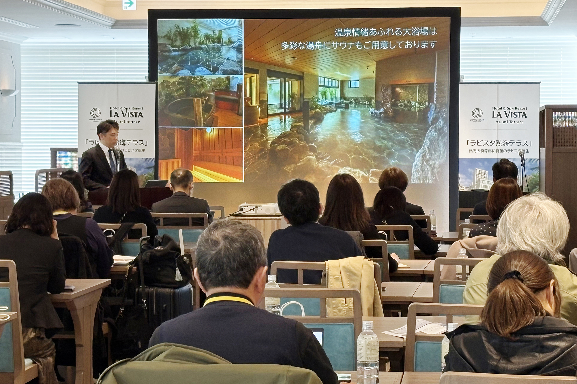 グランドオープンに先立つ2026年3月26日(木)、当ホテルのセントラルスクエア6Fレストラン「SACHI」にて、報道関係者の皆様をお招きした記者発表会を開催いたしました。当日は、株式会社共立メンテナンス 取締役 ホテル事業戦略本部 本部長の鈴木真樹よりご挨拶を申し上げた後、特別ゲストとして一般財団法人 熱海観光局 専務理事(CEO)の上田和佳様にご登壇いただきました。「官民連携で『世界の熱海』へ~熱海の最新観光事情~」と題し、再開発が進む熱海市の現状や今後の展望について貴重なお話を頂戴しました。その後、ホテル事業本部 リゾート首都圏事業部 部長の田野口周よりホテルの概要やこだわりをご説明し、発表会後半では館内ツアーを実施。相模湾を一望できる客室や、湯浴み着で入る展望露天風呂、充実したお食事の展示などを報道関係者の皆様に直接ご体感いただき、大盛況のうちに幕を閉じました。