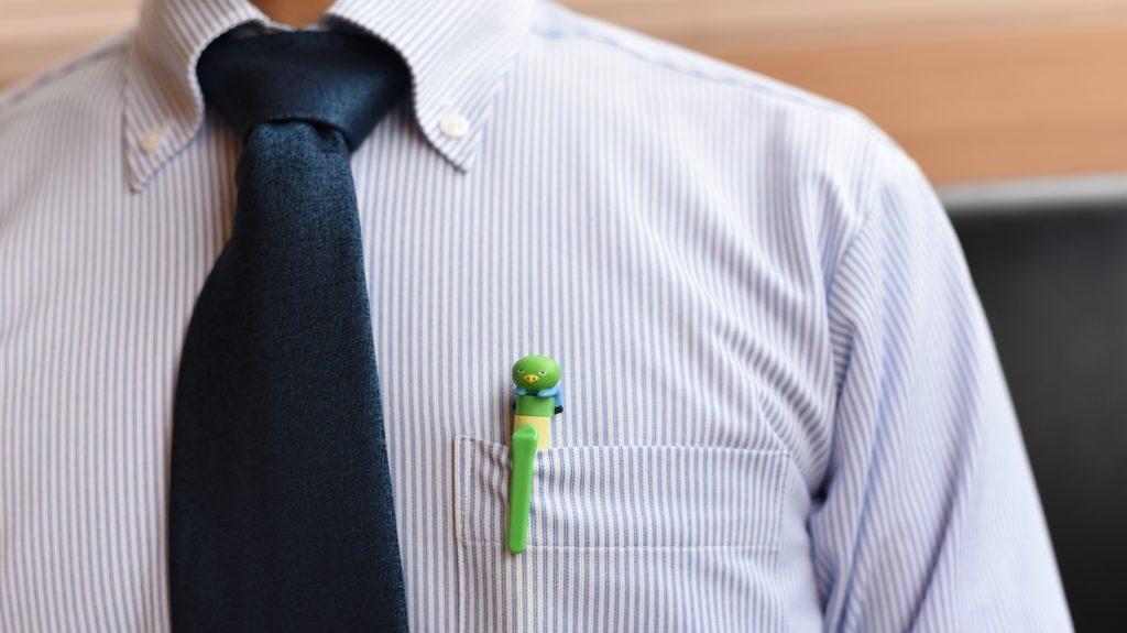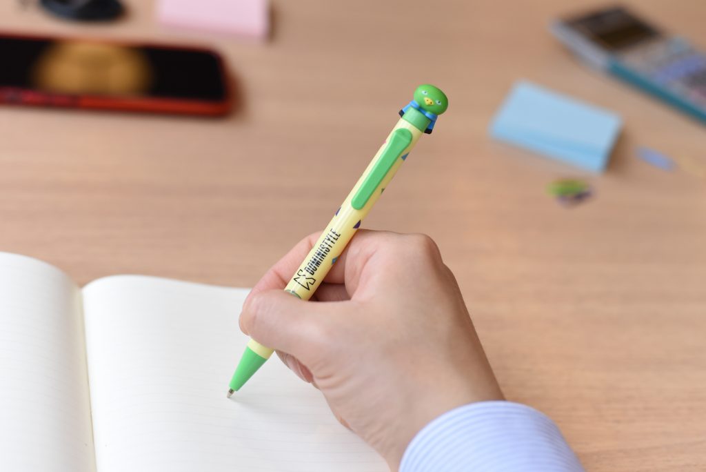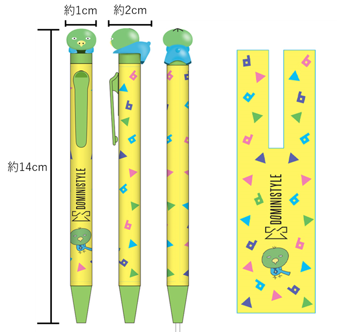 こだわりは、ボールペンを持った時にふとペンを見ると、ドーミーいんこと目が合うこと。ドーミーいんこがあなたを「ジーッと」見つめ、見守ります。