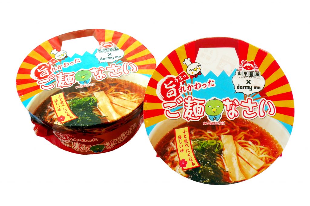 ご麵なさいは、ドーミーイン・共立リゾートにご宿泊の方に提供しているハーフサイズの醤油ラーメン「夜鳴きそば」をもとに、カップラーメンとして商品化したものです。ドーミーインでは、夜鳴きそばの提供時間21:30〜23:00の時間に間に合わなかった方へ25:00までフロントで「ご麺なさい」をご提供しています。