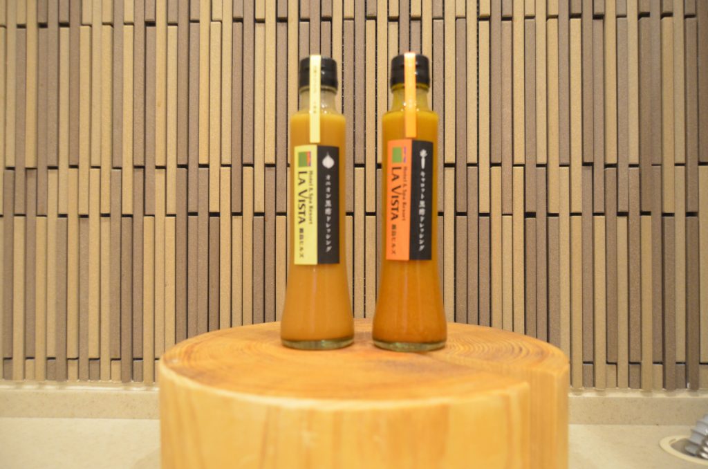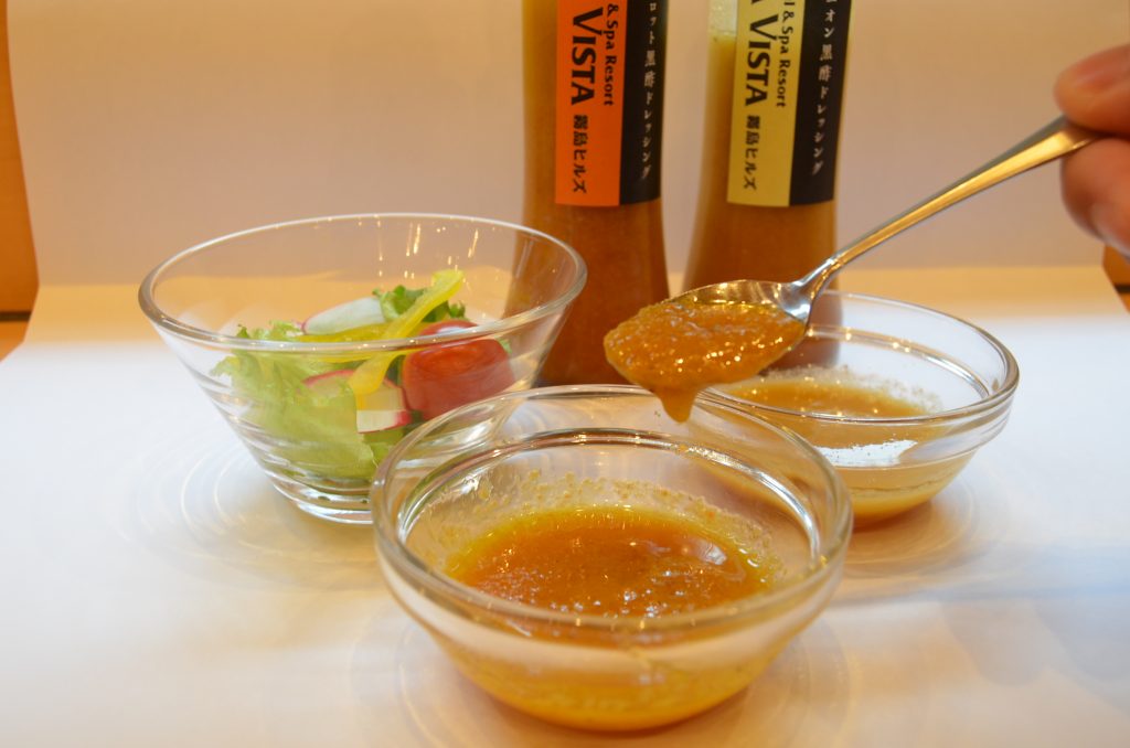 鹿児島県霧島市福山町の福山黒酢株式会社の『桷志田(かくいだ)』で有名な長期熟成玄米黒酢とラビスタ霧島ヒルズのタイアップ商品で、キャロット黒酢ドレッシングとオニオン黒酢ドレッシングの2種類をご用意しております。