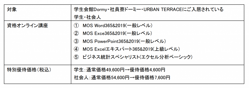 Dormy(ドーミー)の名称で全国500棟以上の学生寮・社会人寮を展開する株式会社共立メンテナンス(以下、共立メンテナンス)は、学生会館Dormy・社員寮ドーミー・ URBAN TERRACE(シェアハウス)にご入居されている学生・社会人を対象に、人気の資格オンライン講座を特別価格でご提供します。