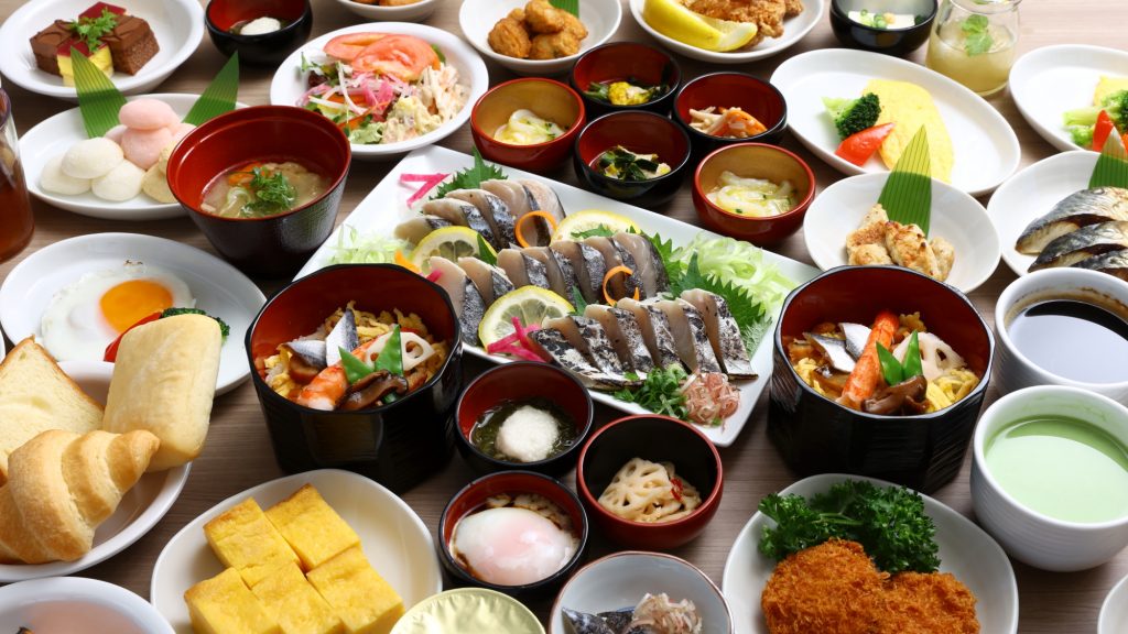 ・朝食はご当地メニューの「岡山ばら寿司」を取り入れた約50種類の和洋バイキングをご提供