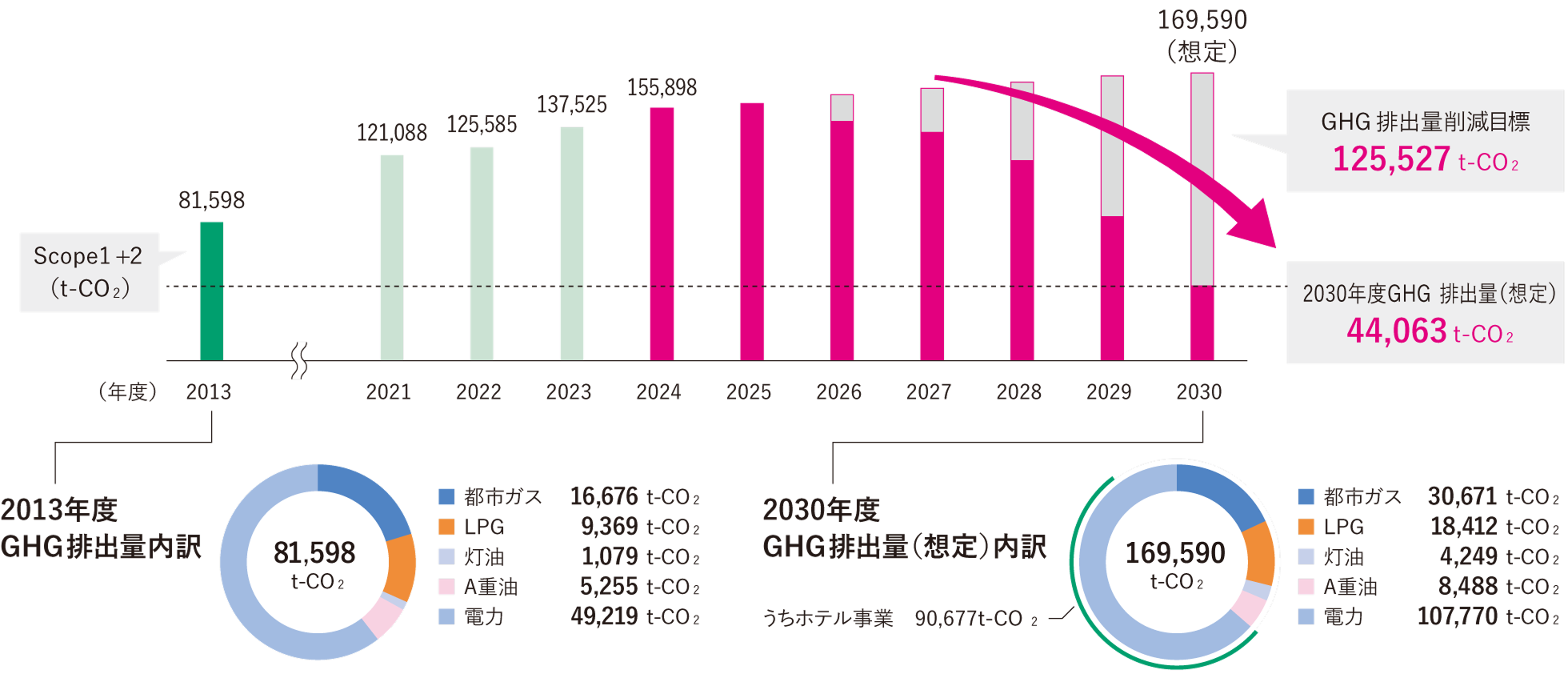 当社グループは、温室効果ガス排出量(Scope1,2)を2030年度までに2013年度比46%削減することを目標としています。