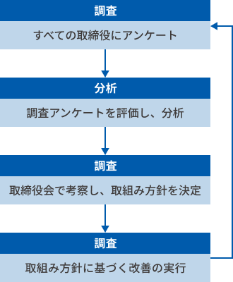 当社は、今後の取締役会の構成および運営等のいっそうの改善を図ることを目的に、毎年1回、事業年度末である3月末から5月にかけて取締役会全体の実効性に関する分析・評価(取締役会実効性評価)を実施しています。