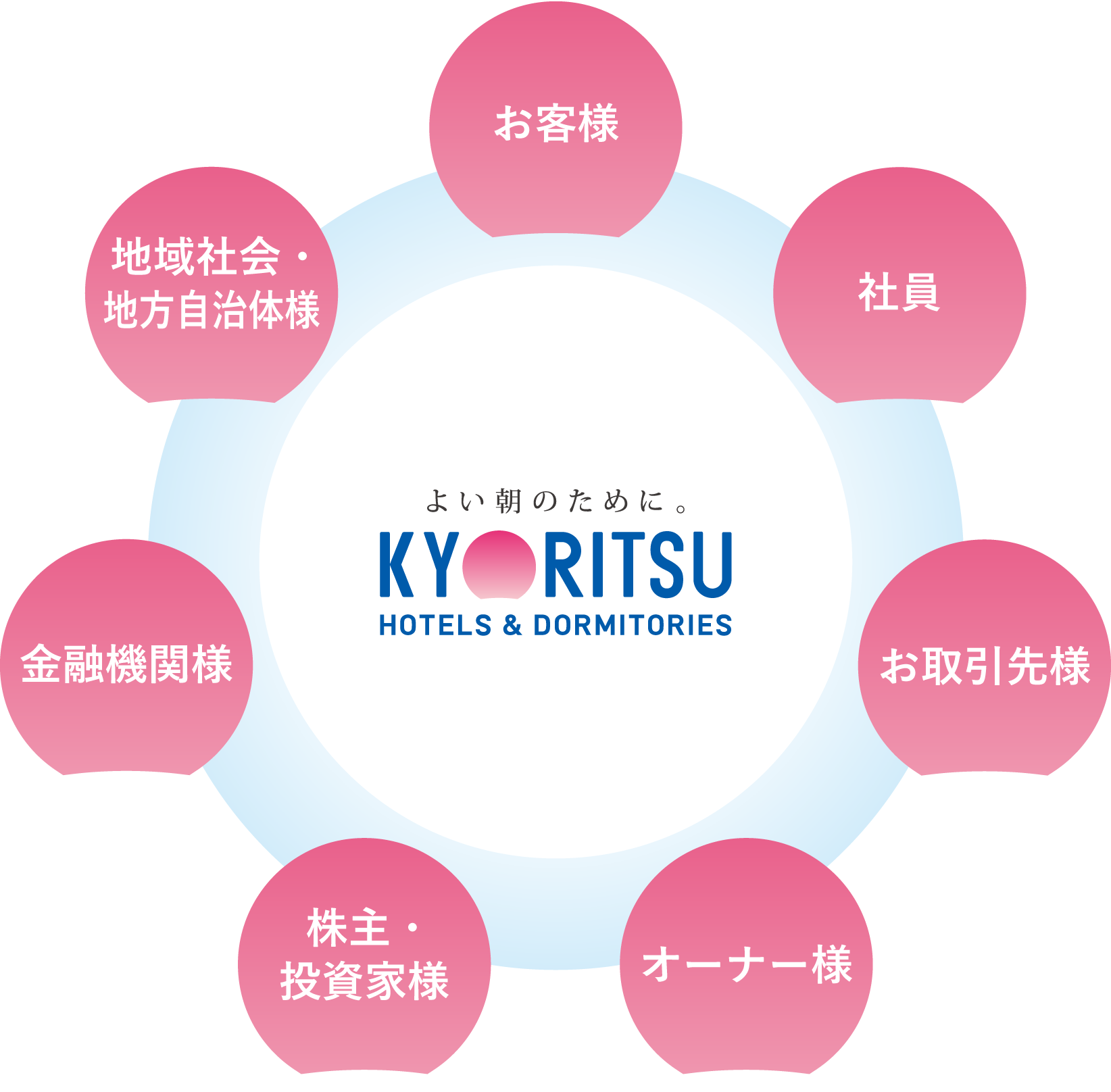 当社は「繁栄を願い、あわせて共益をはかること」を経営理念に掲げており、ステークホルダーの皆様との共存共栄は事業活動における大前提です。お客様、株主様、地域社会の皆様など多様なステークホルダーとの双方向のコミュニケーションを通じて信頼関係を築き、持続可能な企業価値向上を目指しています。